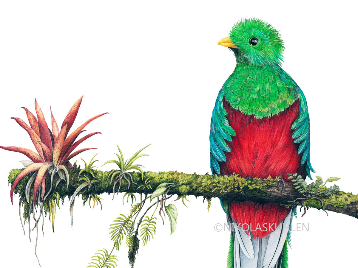 Der Quetzal (Pharomachrus mocinno) gehört zur Familie der Trogone und lebt in Lateinamerika. Er gilt als einer der schönsten Vögel weltweit, besonders spektakulär sind seine bis zu ein Meter langen Schwanzfedern.