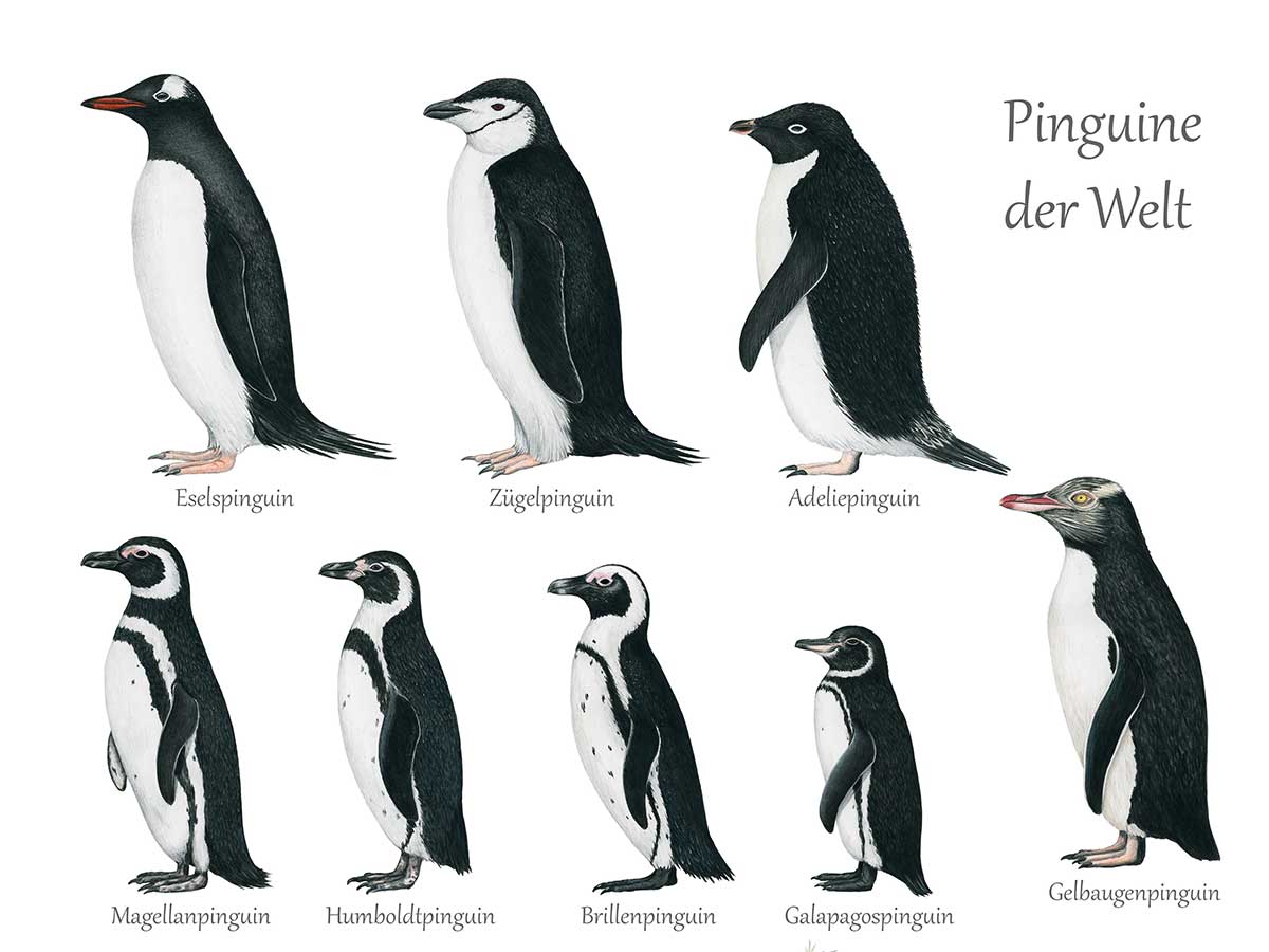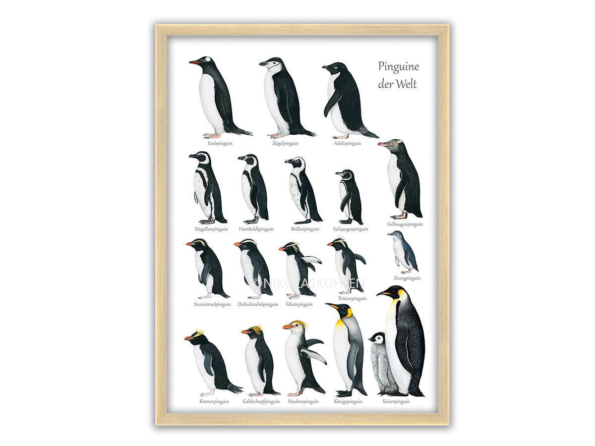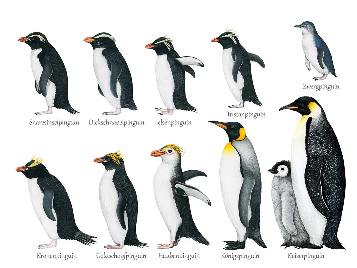 Detaillierte Zeichnungen aller 18 weltweit vorkommender Pinguinarten auf einem wunderschönen Poster.