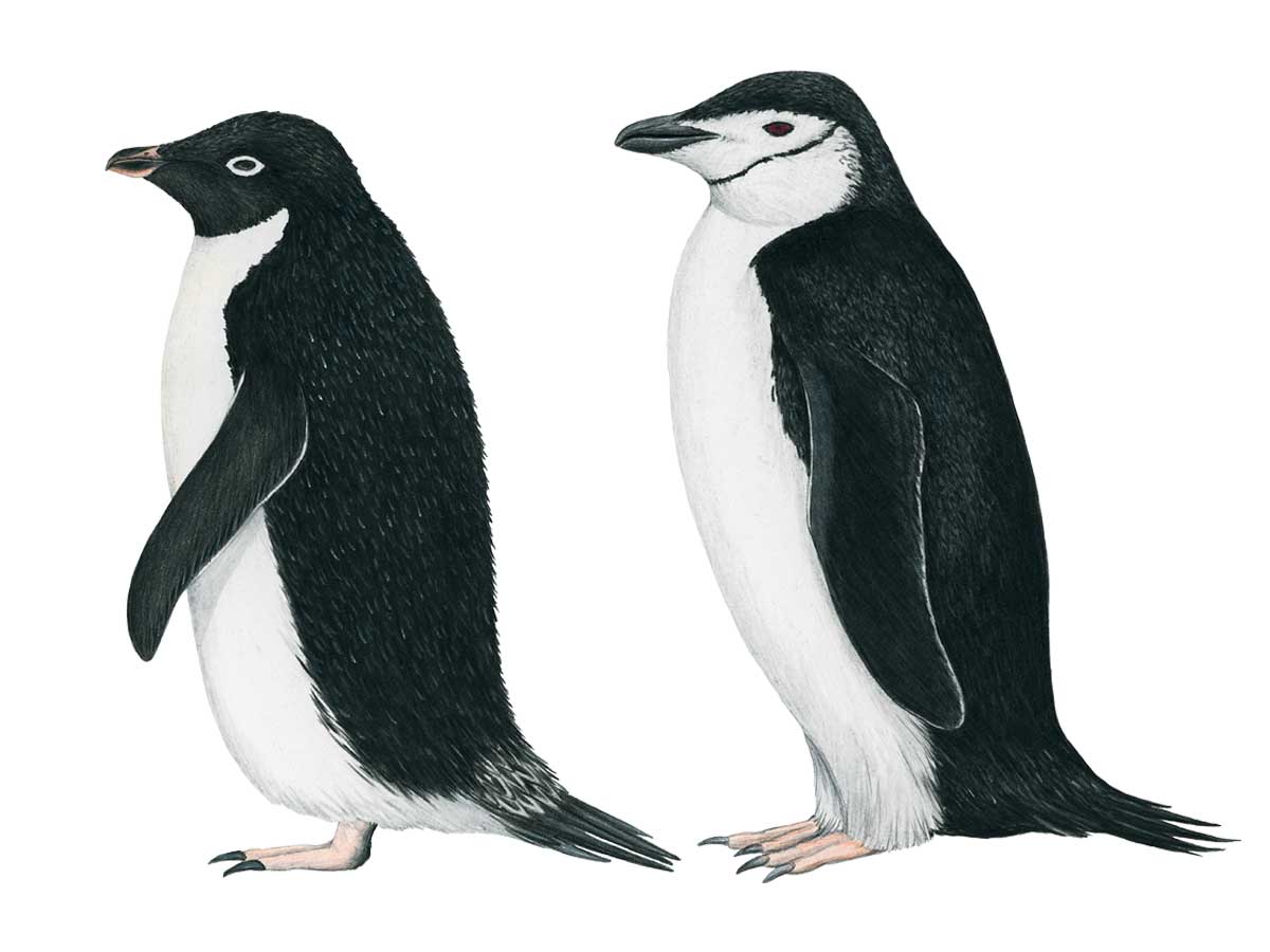 2 gezeichnete Pinguine, links ein Adele- und rechts ein Zügelpinguin